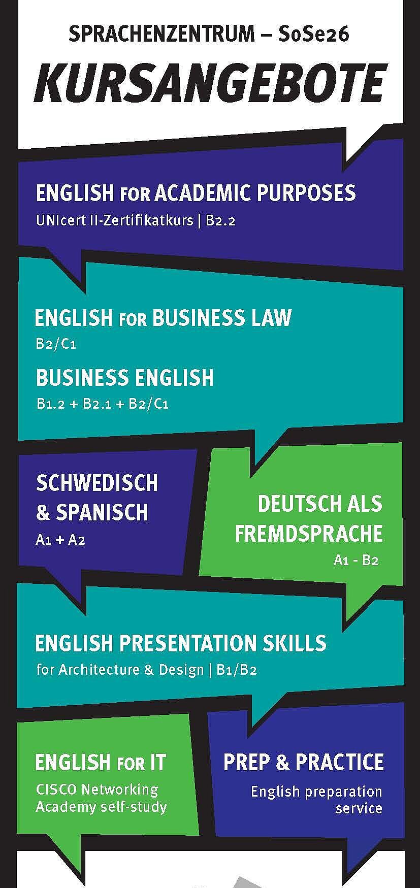Neben den wirtschaftssprachlich fokussierten Modulen Business English I, II + III (B1.2, B2.1 und B2/C1), kann in diesem Semester auch ein rechtswissenschaftlich ausgerichtetes Englischmodul (English for Business Law) belegt werden. Außerdembieten wir abermals den extern akkreditierten Zertifikatskurs UNIcert - English for Academic Purposes auf Niveaustufe B2/C1 an. Hier finden sich ausführliche Informationen zu diesem Modul. Studierenden der Fakultät Gestaltung steht mit Presentation Skills for Students of Architecture and Design (B2)ein “kleines” WPM zur Auswahl.