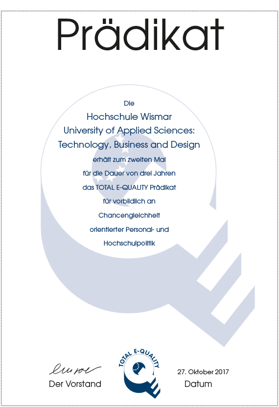 Im Frühjahr 2017 hat sich die Hochschule Wismar wiederholt um das Total E-Quality Prädikatesbeworben und wurde erfolgreich reauditiert! In der Jurybegründung heißt es: