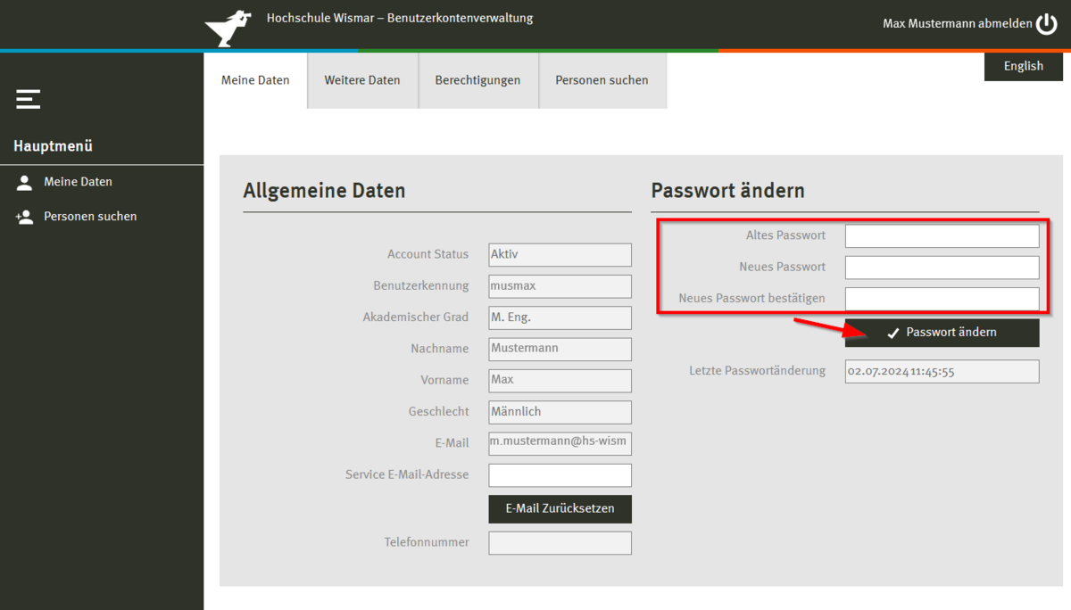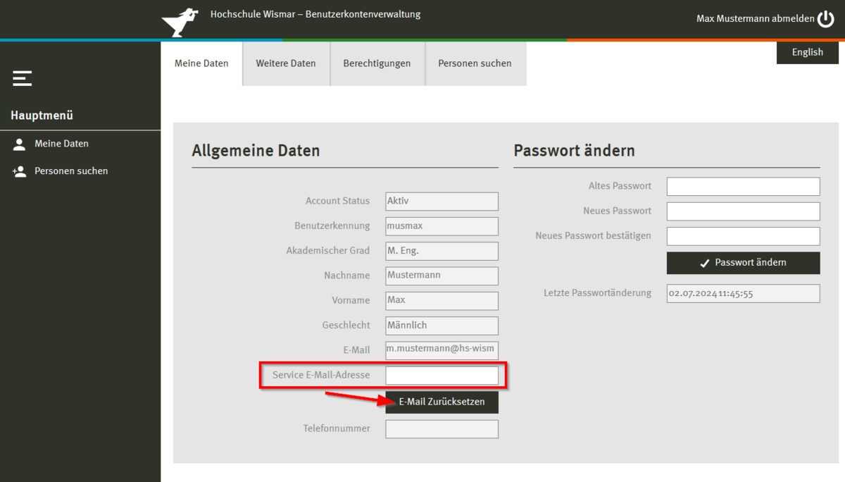 In order to reset the password for your central user ID at the University of Wismar in an emergency, a service email address must be entered in your account. If this is not the case, it is best to do so immediately.