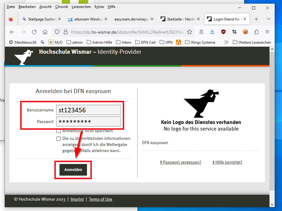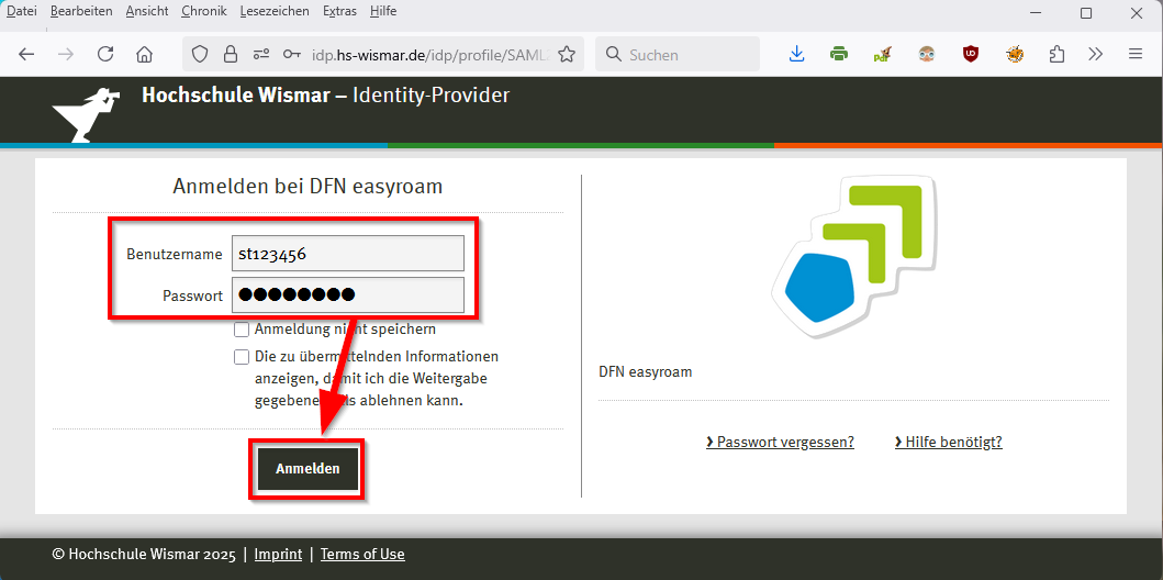 - You will then be redirected to the identity provider of Hochschule Wismar. Log in there with your university access data.