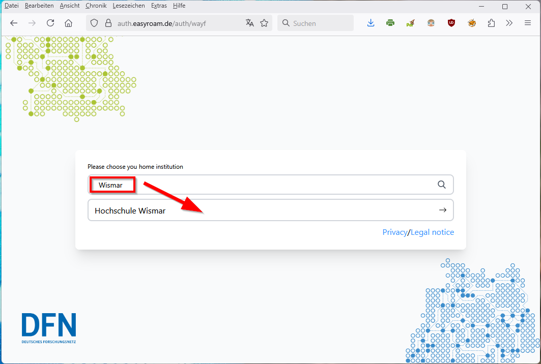 - Search for and select Hochschule Wismar in the Easyroam WAYF browser window.