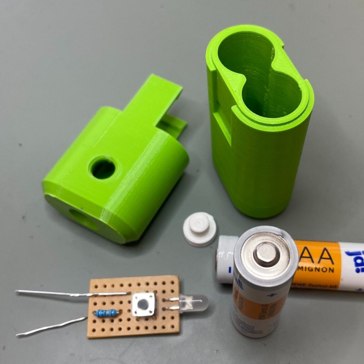 Dieses kleine Bastelprojekt verbindet einfache Grundlagen der Elektrotechnik, Löten und 3D-Druck. Am Ende ist man stolzer Besitzer seiner eigenen batteriebetriebenen Taschenlampe.