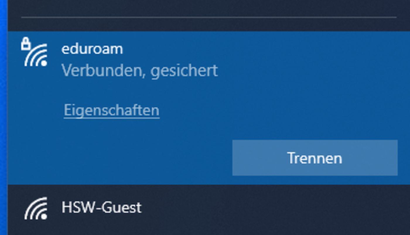 - Die WLAN-Übersicht durch mit einem Linksklick auf das WLAN Symbol in der Taskleiste öffnen. An der HSW-Guest WLAN-Verbindung auf Trennen klicken.