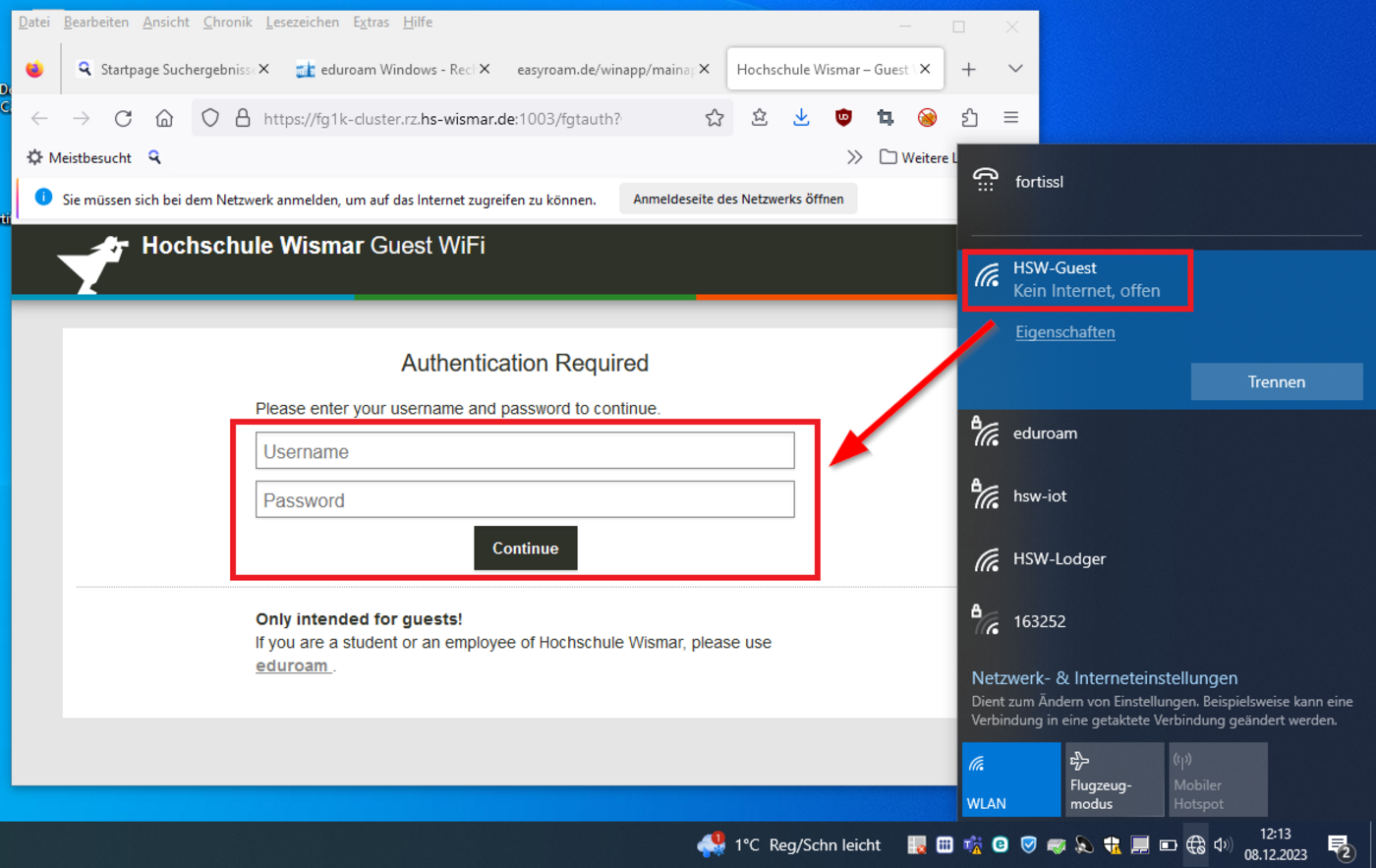 Das WLAN-Netz "HSW-Guest" temporär zur eduroam-Installation nutzen