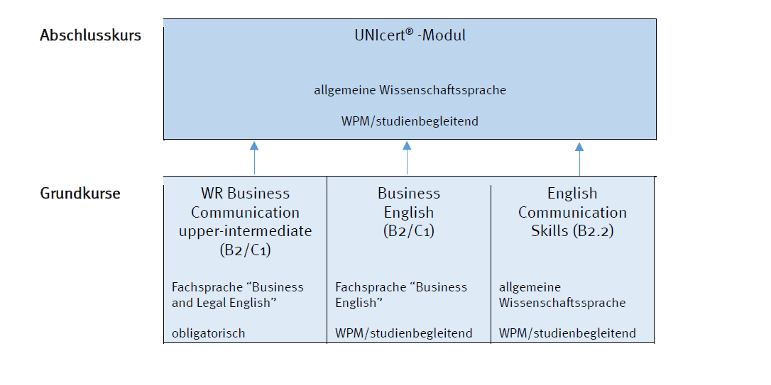 Die Verleihung eines UNIcert II-Zertifikates setzt die Teilnahme an Kursen auf GER-Niveau B2.2 mit einem Umfang von insgesamt 8 SWS voraus. Dabei gelten drei unserer bestehenden Wahlpflichtkurse als „Grundkurse“, die die ersten 4 von den insgesamt 8 SWS ausmachen. Der UNIcert-Abschlusskurs deckt die zweiten 4 SWS ab.