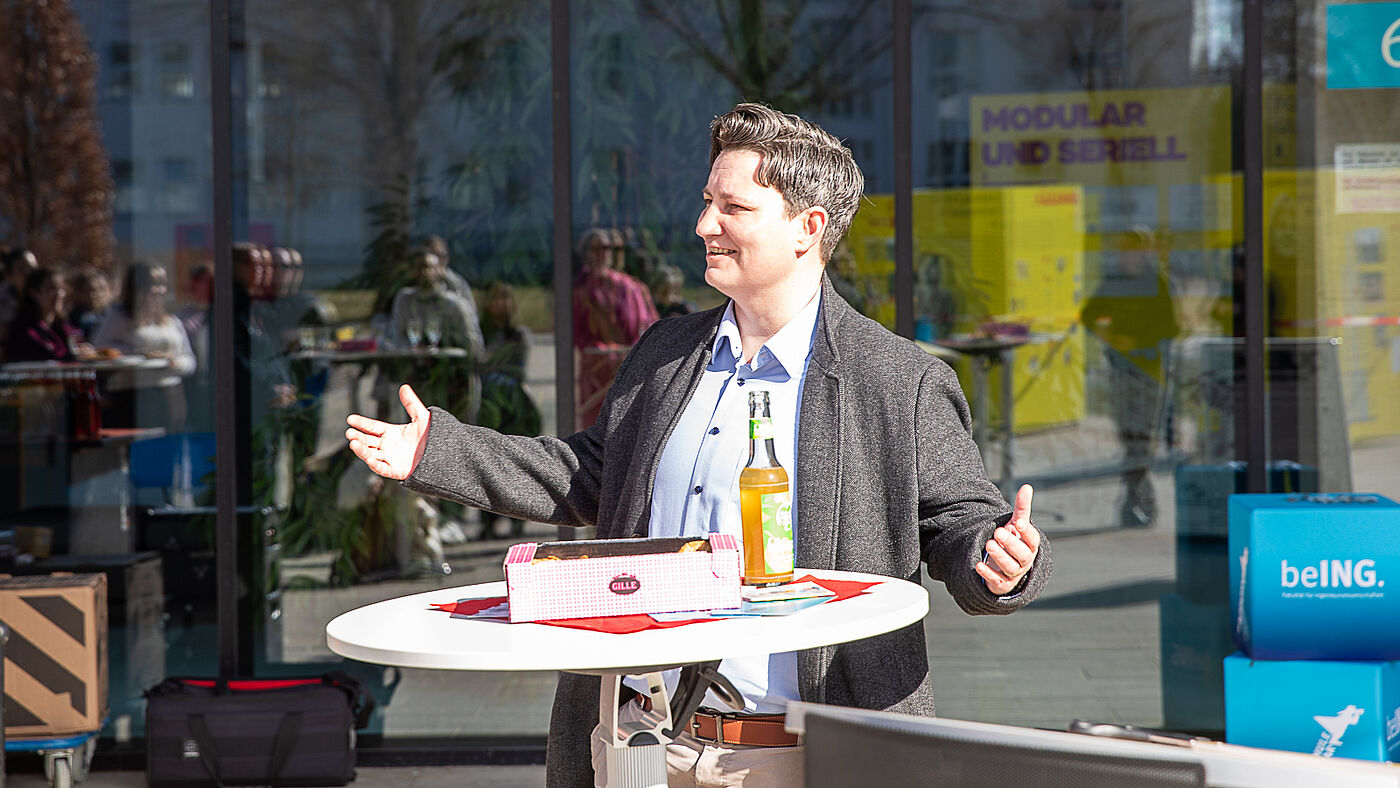 Die Frau steht mit einladen ausgebreiteten Armen hinter einem Tisch. In der Glasfassade hinter ihr sind das Publikum und Teile der leuchtend gelben Ausstellungsstelen zu erkennen.