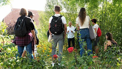 Auf dem Gehweg zwischen geschnittenen Hecken steht eine Gruppe von Personen aufgereiht und schaut in die Kamera.