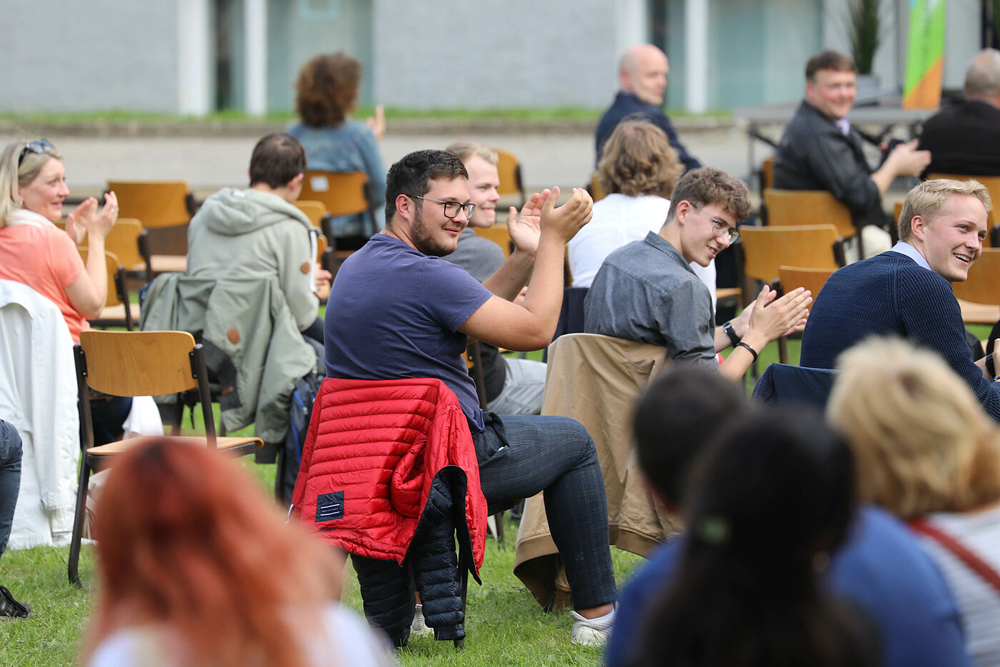Als Vertreter der studentischen Gremien Allgemeiner Studierendenausschuss (AStA) und Studierendenparlament (StuPa) begrüßte Philipp Herbert, StuPa-Präsident, die neuen Kommilitoninnen und Kommilitonen auf studentische Art mit wertvollen Tipps für die Studienzeit. Er übernahm die Verkündung der Preisträger für das Studentische Engagement an Marie Bremer, Maximilian Gedamke, Sarah Scholl, Esther Mia Weisse und Camilla Wilke.