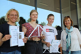 Einen besonderen Preis – außerhalb der Vorgaben – wird es für die jüngsten Teilnehmenden des Papierbrückenwettbewerbes geben: die 3. Klasse der Grundschule Schweriner Nordlichter, die fünf Brücken eingereicht hatte. Dr.-Ing. Gesa Haroske, wissenschaftliche Leiterin des KBauMV und Jurymitglied, wird zu den Knirpsen in die Landeshauptstadt fahren und Eis spendieren.Leider konnte Johannes Heinß vom Gymnasium „Am Sonnenkamp“ in Neukloster den Preis für die schönste Brücke und damit einen Gutschein in Höhe von 40 Euro nicht persönlich entgegennehmen. Er hatte die Jury mit einer Mini-Papierversion der Leonardo-Brücke überzeugt.