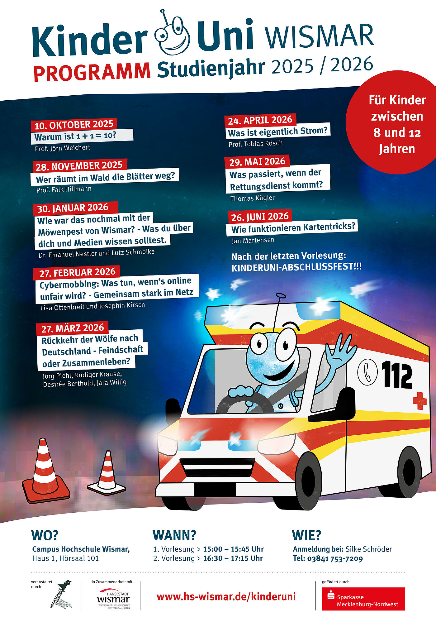 (Wismar) Am Freitag, dem 10. Oktober 2025, wird der Wismarer Professor Dr.-Ing. Jörn Weichert die erste Wismarer KinderUni-Vorlesung des Studienjahres 2025/2026 bestreiten. In der Vorlesung „Warum ist 1+1=10“ werden Studieninteressierte im Alter von 8 bis 12 Jahren erfahren, wie Computer rechnen. Alle KinderUni-Studierenden können sich die Vorlesungen heraussuchen, die sie gern besuchen möchten und sich über die Webseite www.hs-wismar.de/kinderuni anmelden. Dabei müssen sie sich entscheiden, ob sie zur ersten Vorlesung um 15:00 Uhr oder zur zweiten um 16:30 Uhr kommen möchten. Die KinderUni-Vorlesungen finden wie gewohnt im Haus 1, Hörsaal 101 statt.